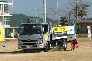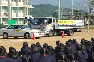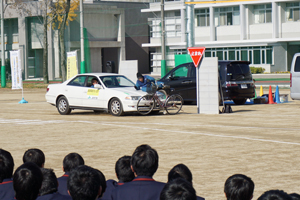 自転車交通安全教室では自転車が関わる事故をスタントマンの方が再現してくださり、それを見学させていただきました。自転車と自動車、自転車と歩行者が実際に衝突する様子は衝撃的で、生徒たちも交通事故の怖さが強く感じたようです。