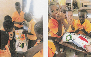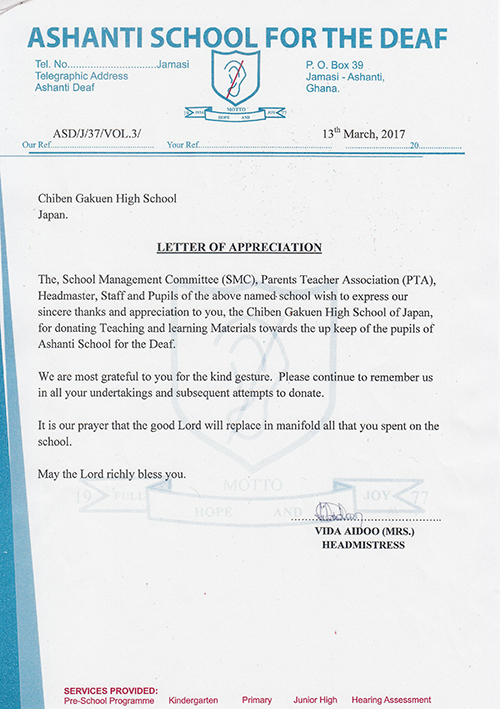 家庭科の授業で昨年度の高校2年生が制作した布絵本を、JICAを通じて西アフリカ・ガーナ共和国のアシャンティろう学校に寄贈しました。はるばる海を越え2月にガーナに到着したそうです。ガーナでは学ぶための教材がほとんど無いらしく、ろう学校の生徒達は興味津々で、布絵本を使って楽しそうに学んでいたそうです。また先生方からは「授業の副教材として大切に使わせていただきます」という、喜びの声をいただきました。