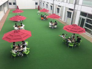 中庭のオープンスペースにテーブルとイス、パラソルが設置され、食事や読書、談話に利用できるようになりました。今後も充実させていく予定です。