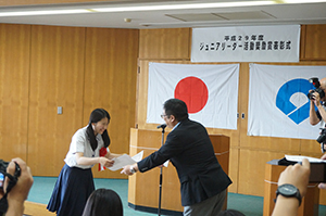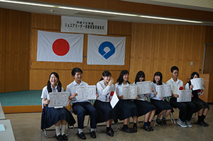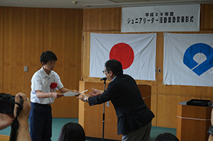 6月17日(土)和歌山県橋本市の伊都振興局で、地元の青少年を育てる循環システムを推進する子どもの健全育成に取り組む活動に貢献したことに対し、高校3年の前東大文君と是枝美海さんがジュニアリーダー活動奨励賞を受賞しました。