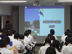 本年度は京都大学・大阪大学・神戸大学・大阪市立大学・大阪府立大学・奈良教育大学の6つの大学を生徒の見学希望に合わせて3つのコースに分かれての実施です。大学の担当の方から大学や学部の特色・入試についてなどの講義を受けた後、敷地内散策や学食体験・卒業生との座談会などを体験しました。
