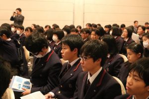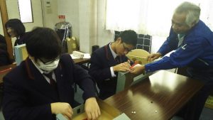 秋晴れの中、中学3年生は11月1日に活気ある中小企業の町として有名な東大阪市へ企業見学に出かけました。ワショウ金属工芸 部長 土屋善士様の講演の後、6つの企業を見学させていただきました。真剣にモノづくりに打ち込む技術者、職人の方々の姿と、使う立場に立った思いやりある製品作りに生徒たちは感銘を受けました。また、実際にモノづくりの体験をさせていただき、ものを作る楽しさを知ったようです。