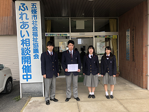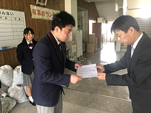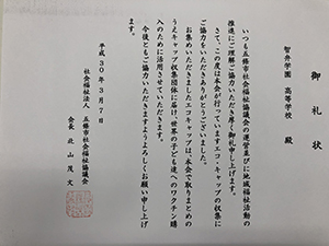 生徒会の呼びかけで、かねてより校舎の各階に回収箱を設置するなど、全校で取り組んでいるエコキャップ回収活動。3月7日(水)に生徒会執行部が、校内で集めたものを五條市社会福祉協議会に提出してきました。この活動に対して、御礼状をいただきました。今後とも全校生の協力の下、活動を続けていきます。