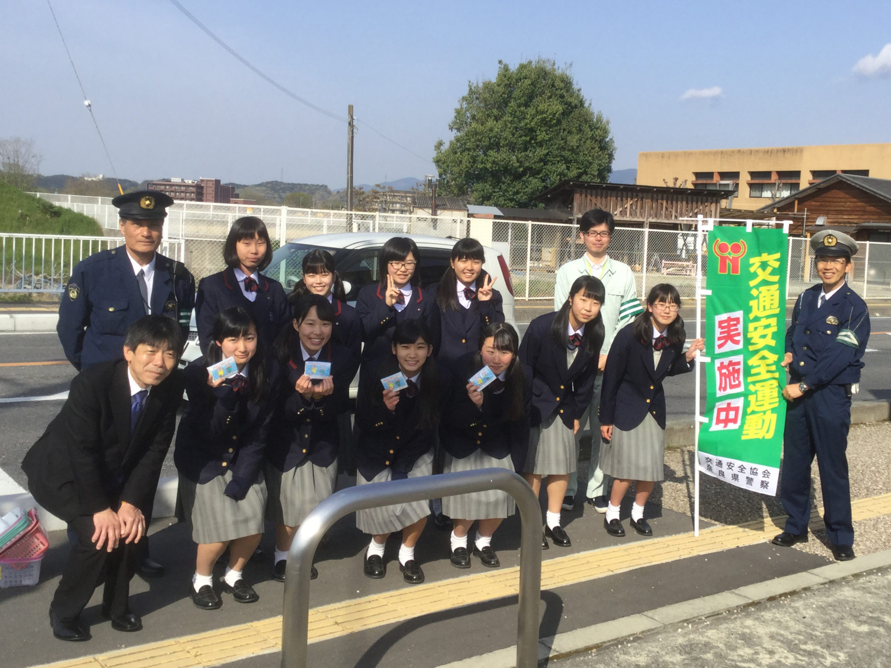 春の交通安全週間が始まりました。高校2年生有志10名が、4月9日(月)始業前、交通事故防止の願いを込めて家庭科の授業で作成した交通安全のお守りを五條警察署のご協力のもと、五條病院前交差点にてドライバーの方々に配布しました。ドライバーの方々は快くお守りを受け取って下さり、「ありがとう、ご苦労様」などの言葉をかけてくださり、生徒たちは交通安全啓発活動の一端を担えたことを喜んでいました。今後も地域とのつながりを大切にしながら、このようなボランティア活動を続けてまいります。