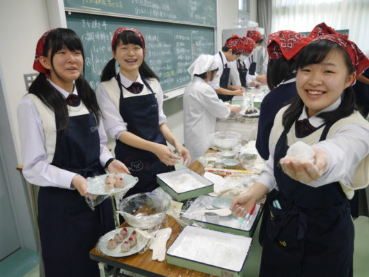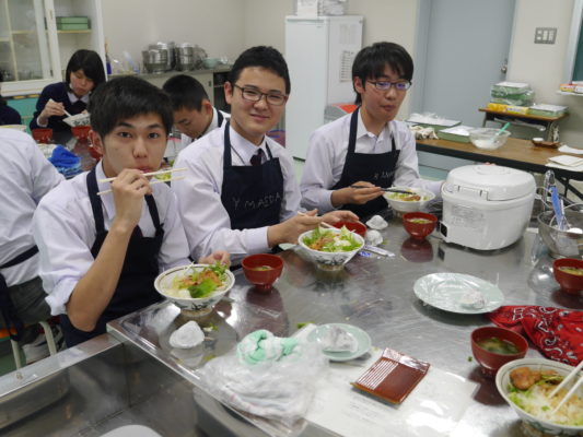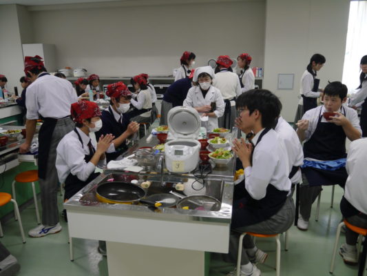 後片付けまでスムーズに出来た班もありましたが、「ご飯炊けてない」「求肥でいちご、うまく包めない」など失敗する班も。それでもなんとか完成し、お昼休みにみんなで美味しくいただきました。