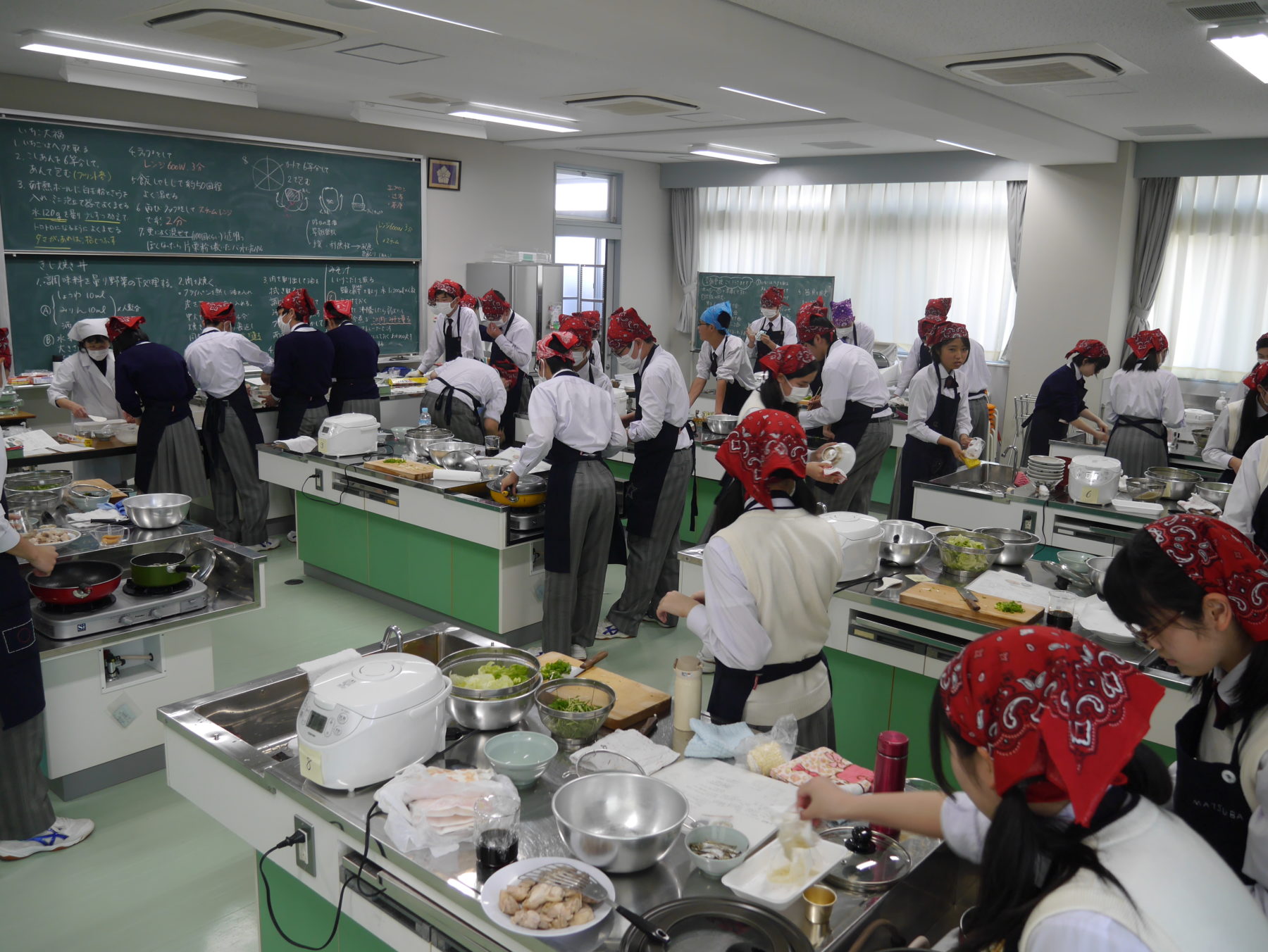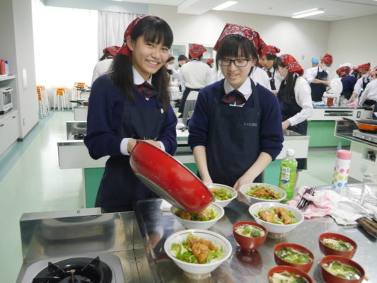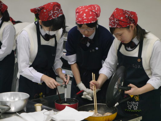 家庭科の授業、今日は調理実習でした。メニューは、キジ焼き丼・みそ汁・いちご大福。