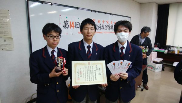 | 5月13日、「文部科学大臣杯 第14回中学生将棋団体戦 奈良県予選」が、三郷町文化センターで行われました。 本学園からは6名が参加し、熱戦の結果、次のチームが、準優勝しました。 馬塲 佑作くん(中学3年)、伊藤 豪規くん、大池 陽斗くん(中学2年)の3名です。 |
