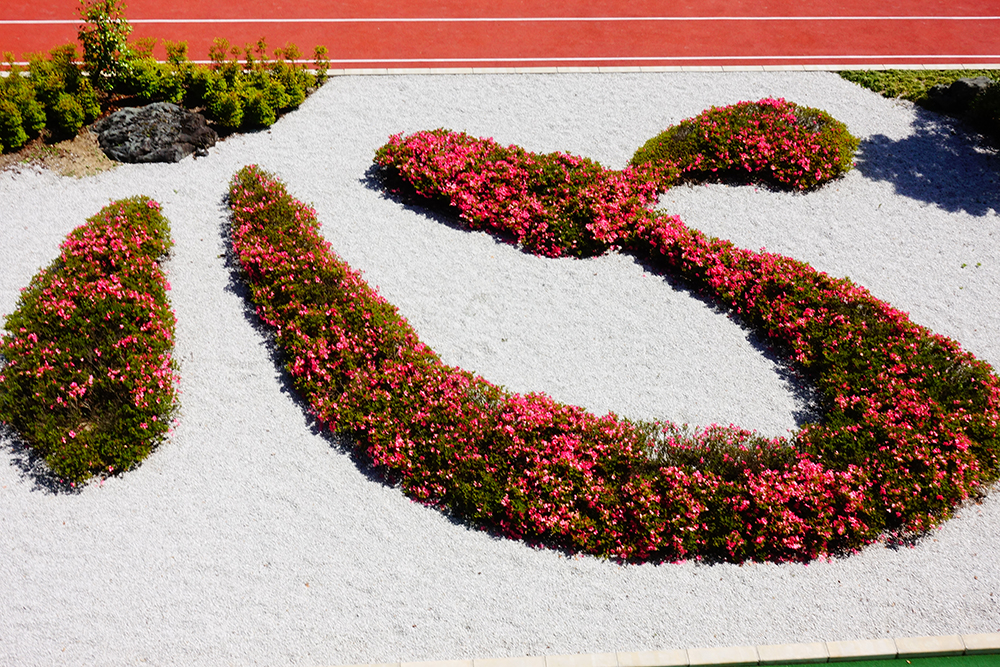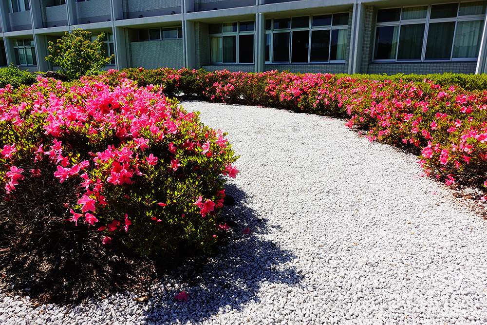 「こころの庭」は旧校舎の中庭にあった、心の形をした庭石の配列を模して、植栽により再現したものです。今、ちょうど見頃を迎えています。 中学校校長 辻