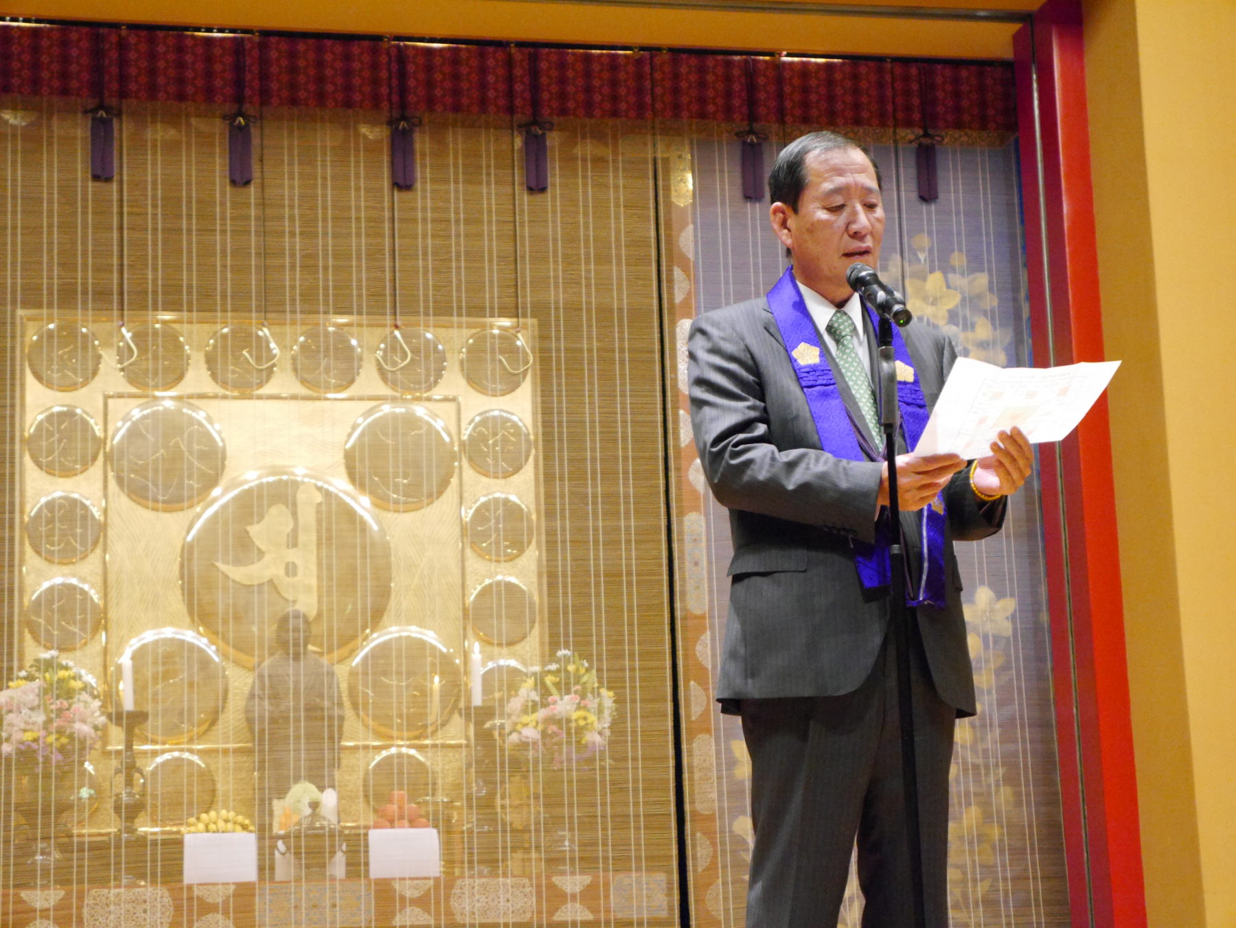 お経の本を持って、みんな一生懸命に般若心経などをお唱えしました。 その後、藤田理事長先生は年度初めの感謝祭にあたり、生徒たちに「リーダーシップのとれる人になってほしい」と、願いを話されました。 |