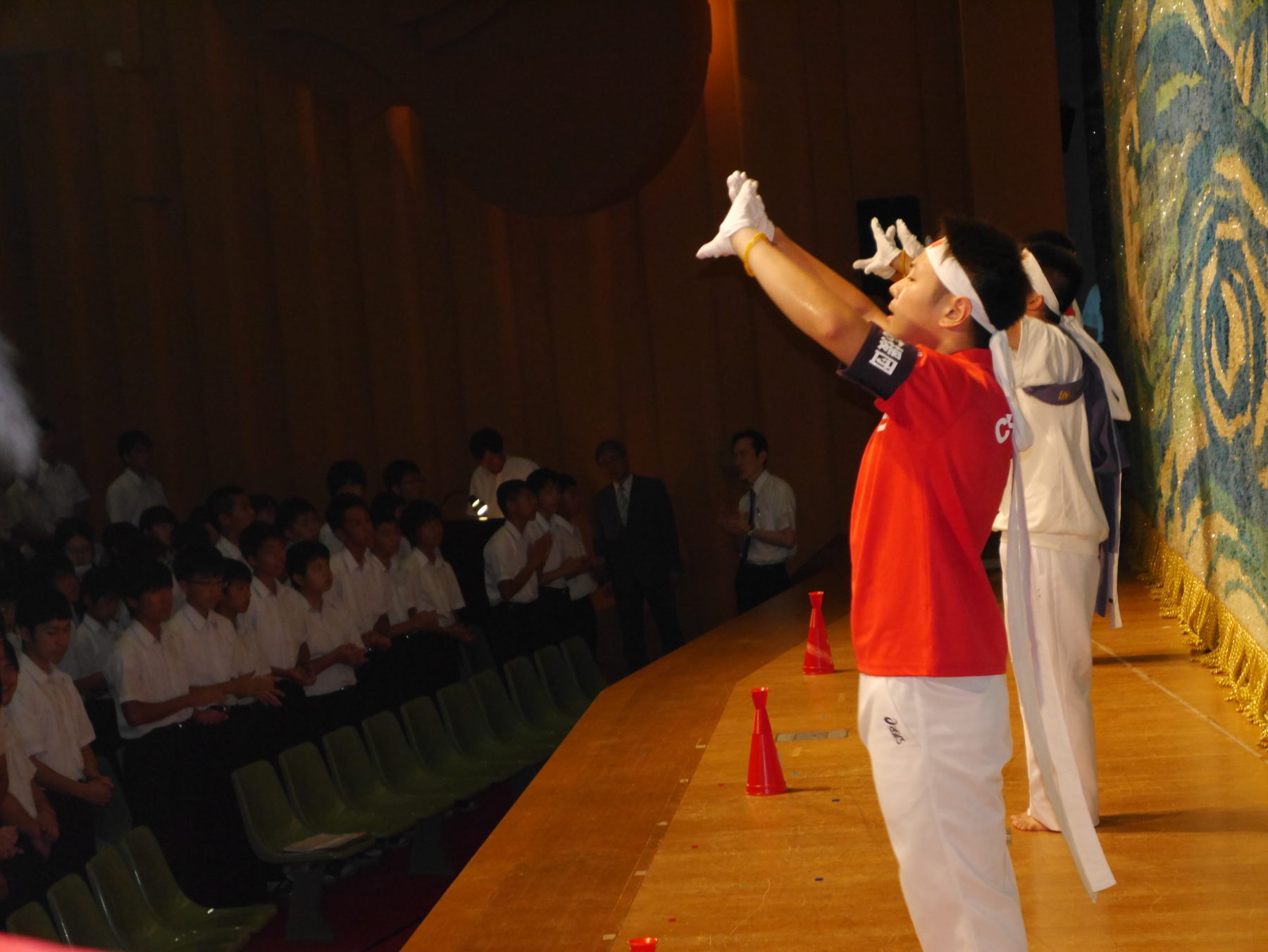 | 7月9日(月)、全校生徒出席のもと、野球部壮行会が講堂で行われました。 まず、手塚校長先生から、勝ち続けることの難しさ、そして「困難を乗り越え、有難うと言えるよう頑張れ」と、激励のお話がありました。 |