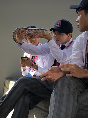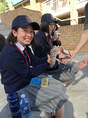 生徒たちは、オーストラリアにしか生息していない生き物たちと触れ合いました。みんな、カンタベリーカレッジの帽子をかぶっています。