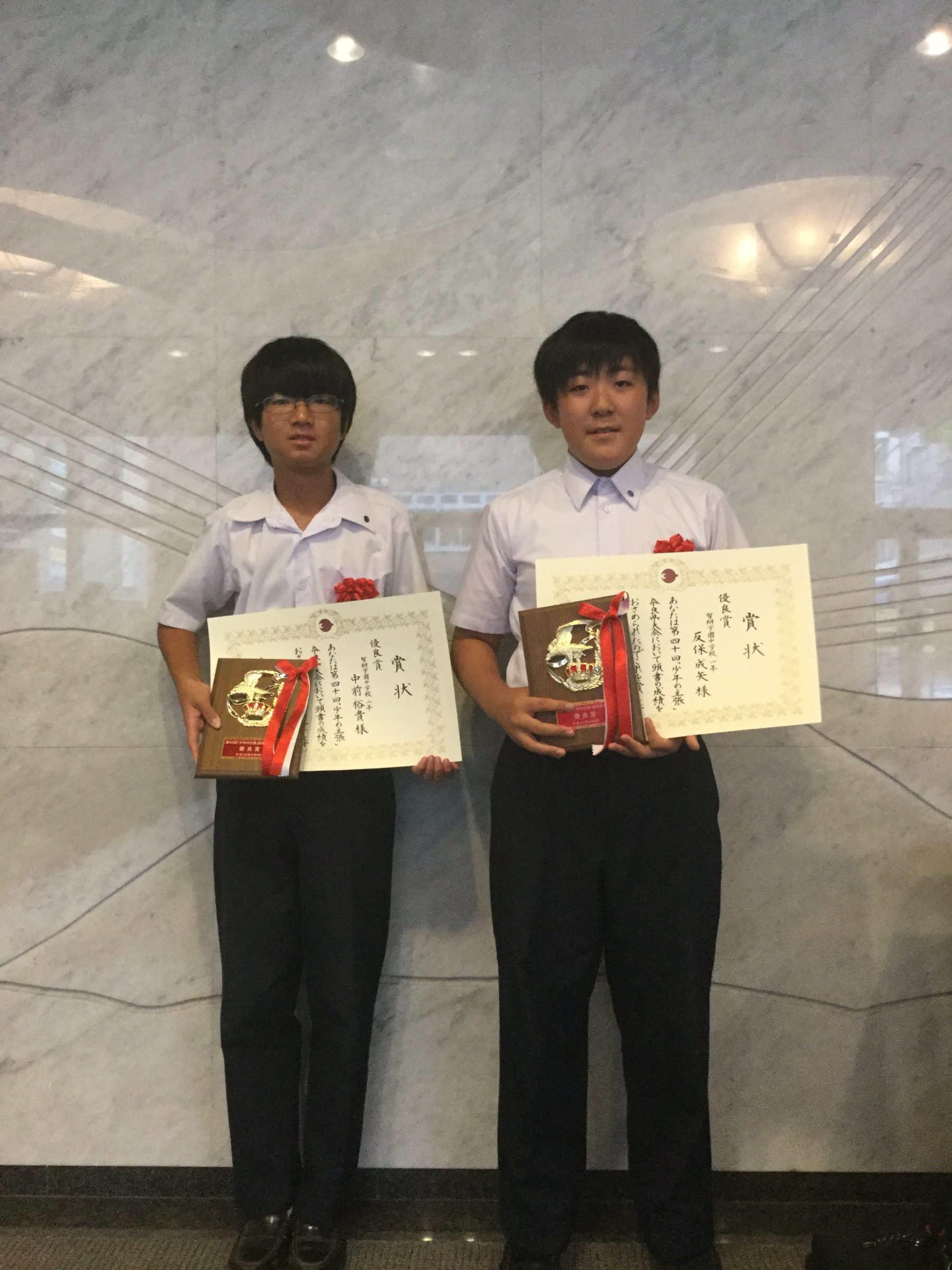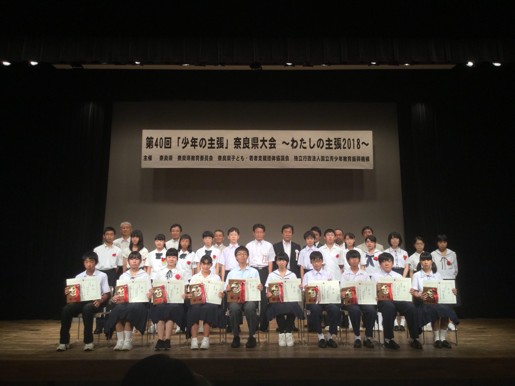 9月9日(日)に第40回「少年の主張」奈良県大会が開催されました。3,267作品の応募の中から本校では中学2年中前裕貴君の「当たり前の人」、中学1年反保成矢君の「家族と人と家の大切さ」が選ばれ、生駒市コミュニティセンター文化ホールで発表しました。その結果、中前君と反保君がともに優良賞を受賞しました。おめでとうございます。