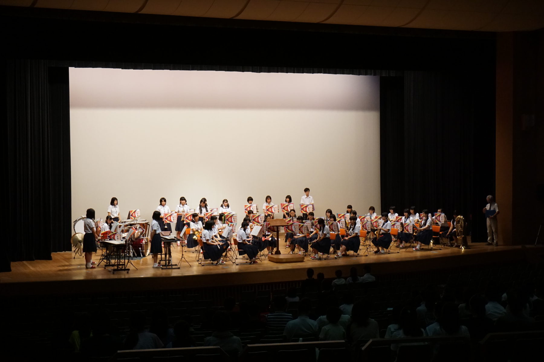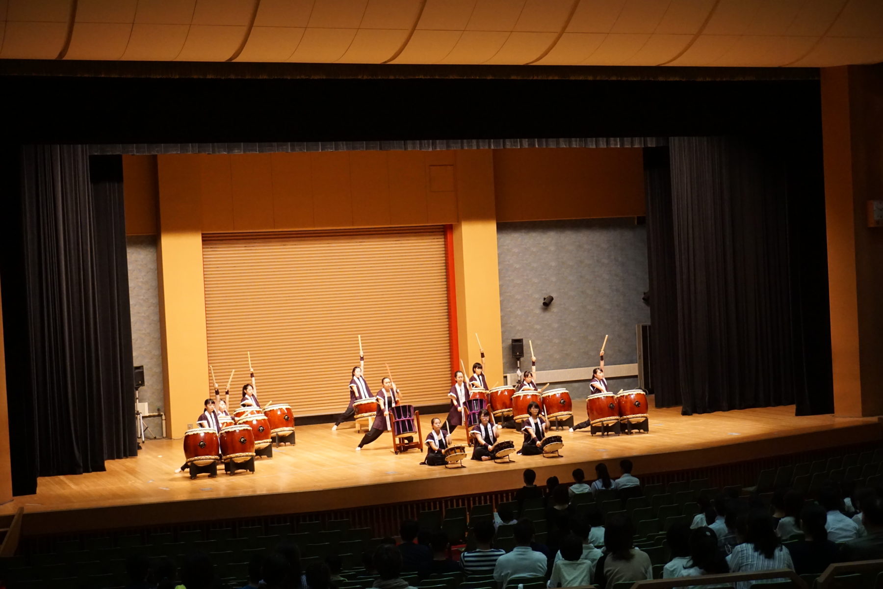 講堂では、辻中学校長の挨拶の後、和太鼓部と吹奏楽部の演奏をお聞きいただきました。