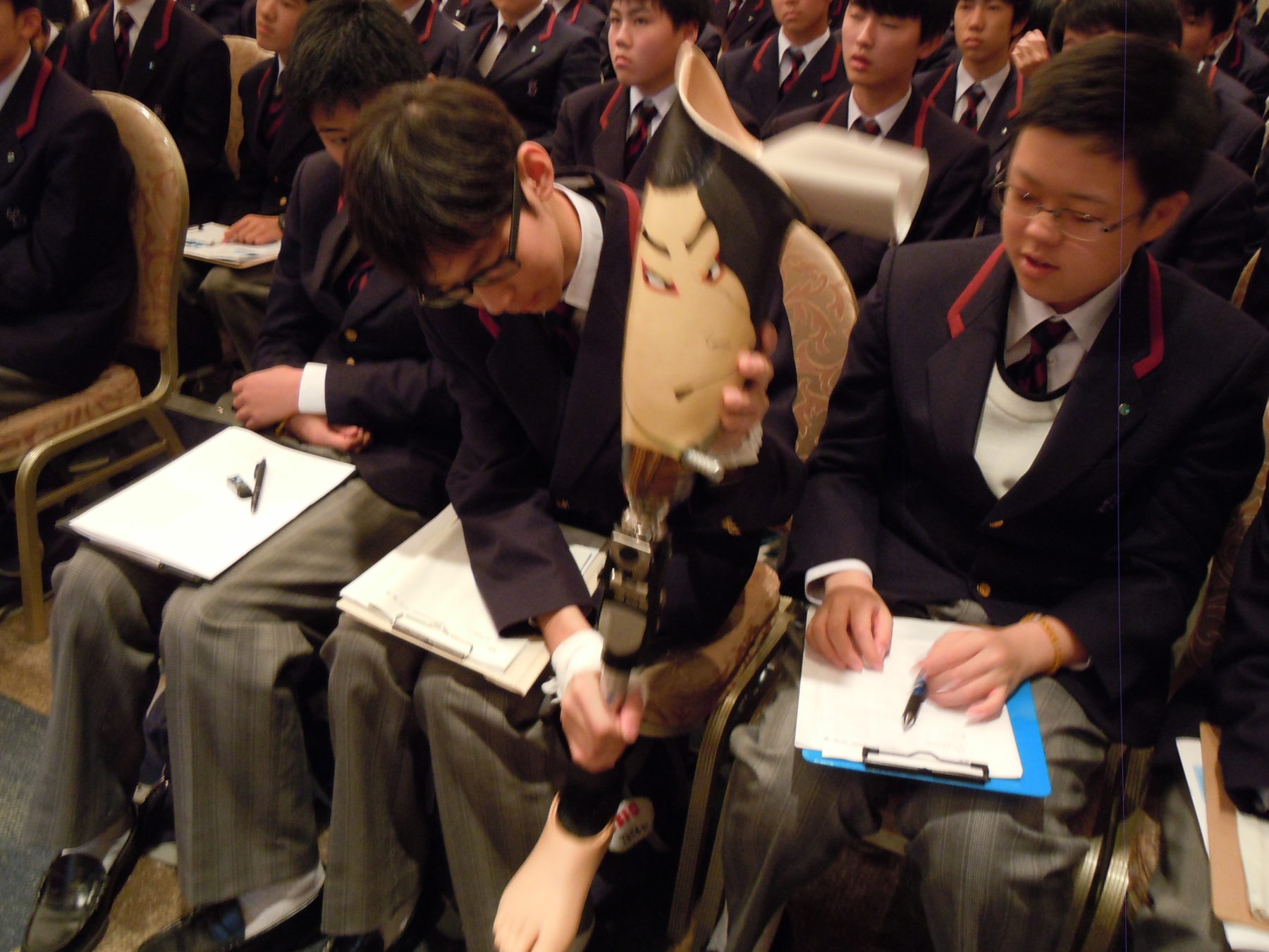 川村様からのご講演です。実際に義足や義手に触れる生徒達は真剣そのものでした。