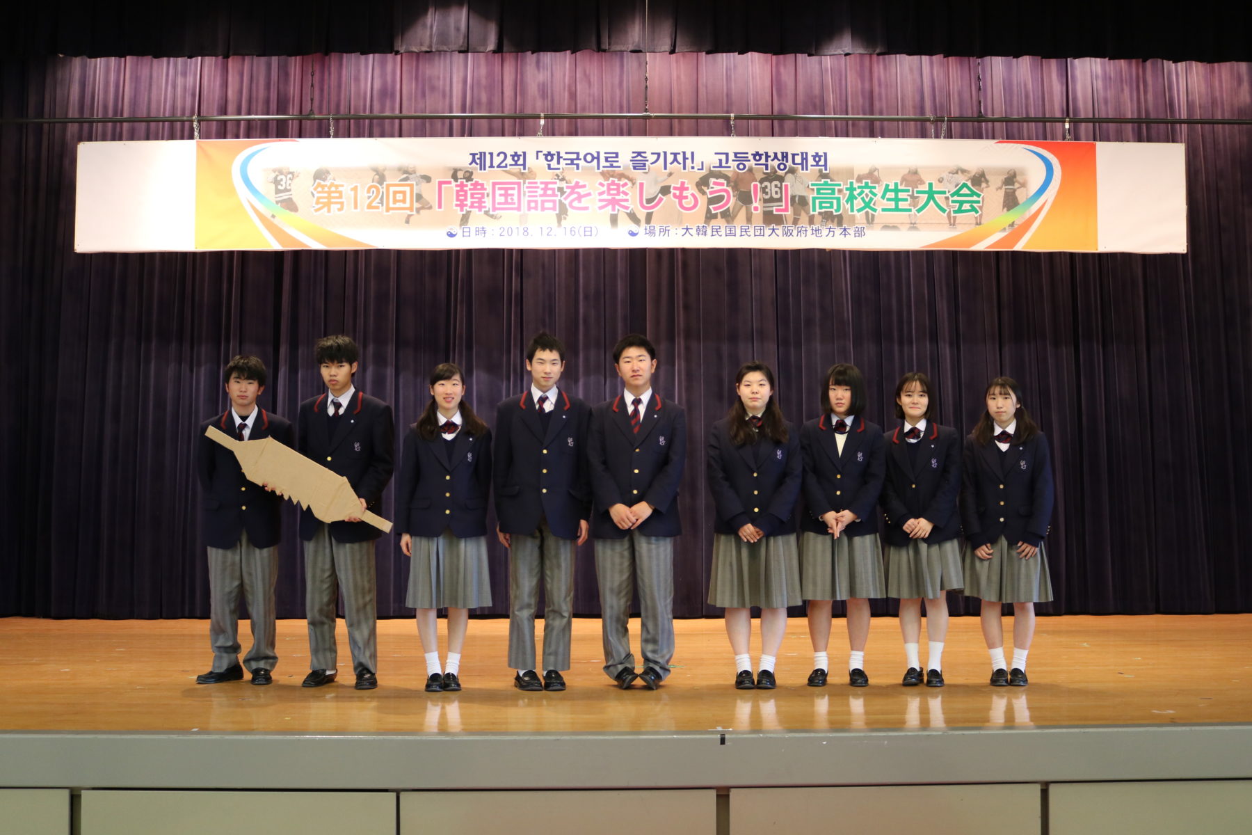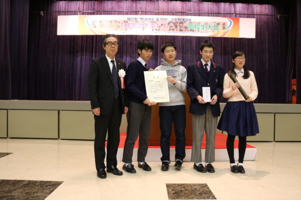 12月16日(日)に大阪韓国人会館で具嶋将大君・奥野愛華さん・中田岳君・瀬浦侃央君のチームと廣田華凜さん・藤見優依さん・安井七星さん・新谷琴子さんのチームが大会に出場しました。日頃のハングル講座で培った韓国語で、両チームとも堂々と劇を演じ、誇らしい姿を見せてくれました。結果、うち1チームが大阪府教育委員会賞(優秀賞)という大会で2番目に良い賞を受賞しました。