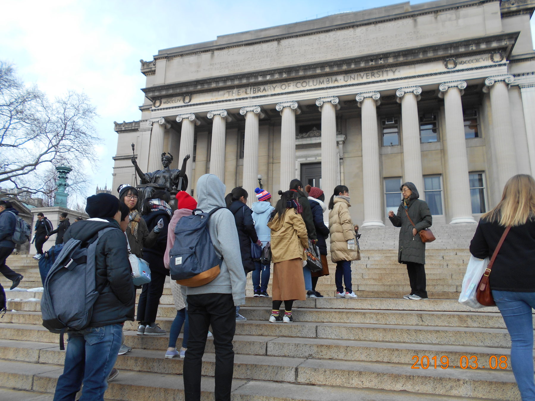 コロンビア大学のかつての図書館前で話す日本人ガイドと生徒たち