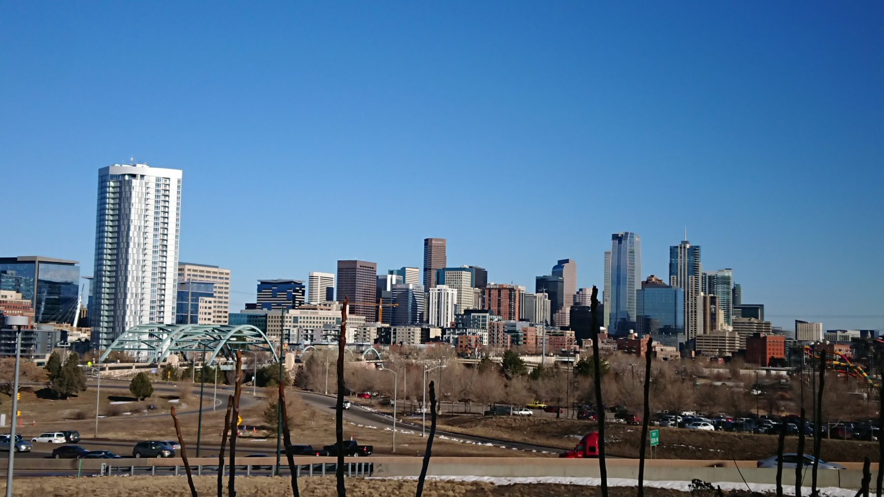 岡の上から見た、デンバーの中心街の写真