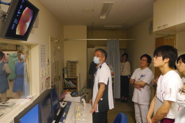 大腸内視鏡検査を行っている様子を、モニター室から見学。
