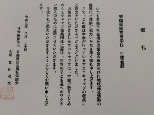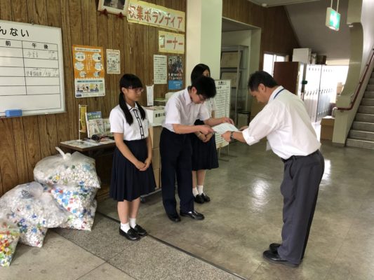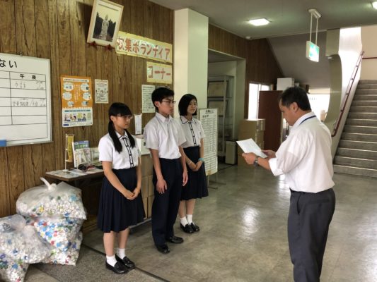 8月30日(金)に生徒会執行部の3名が、校内で集めたエコキャップを五條市の社会福祉協議会に提出してきました。
