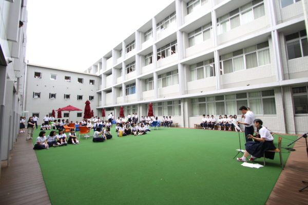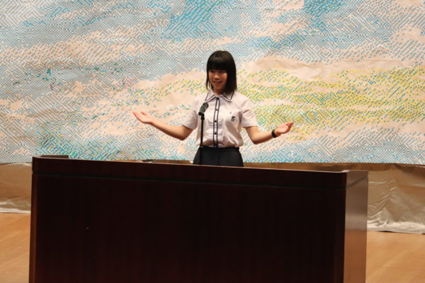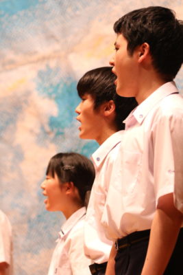 その後、講堂発表(午前の部)では、少年の主張、英語スピーチ、高1女子による創作ダンス、バトントワリング、そして吹奏楽部の演奏が行われました。