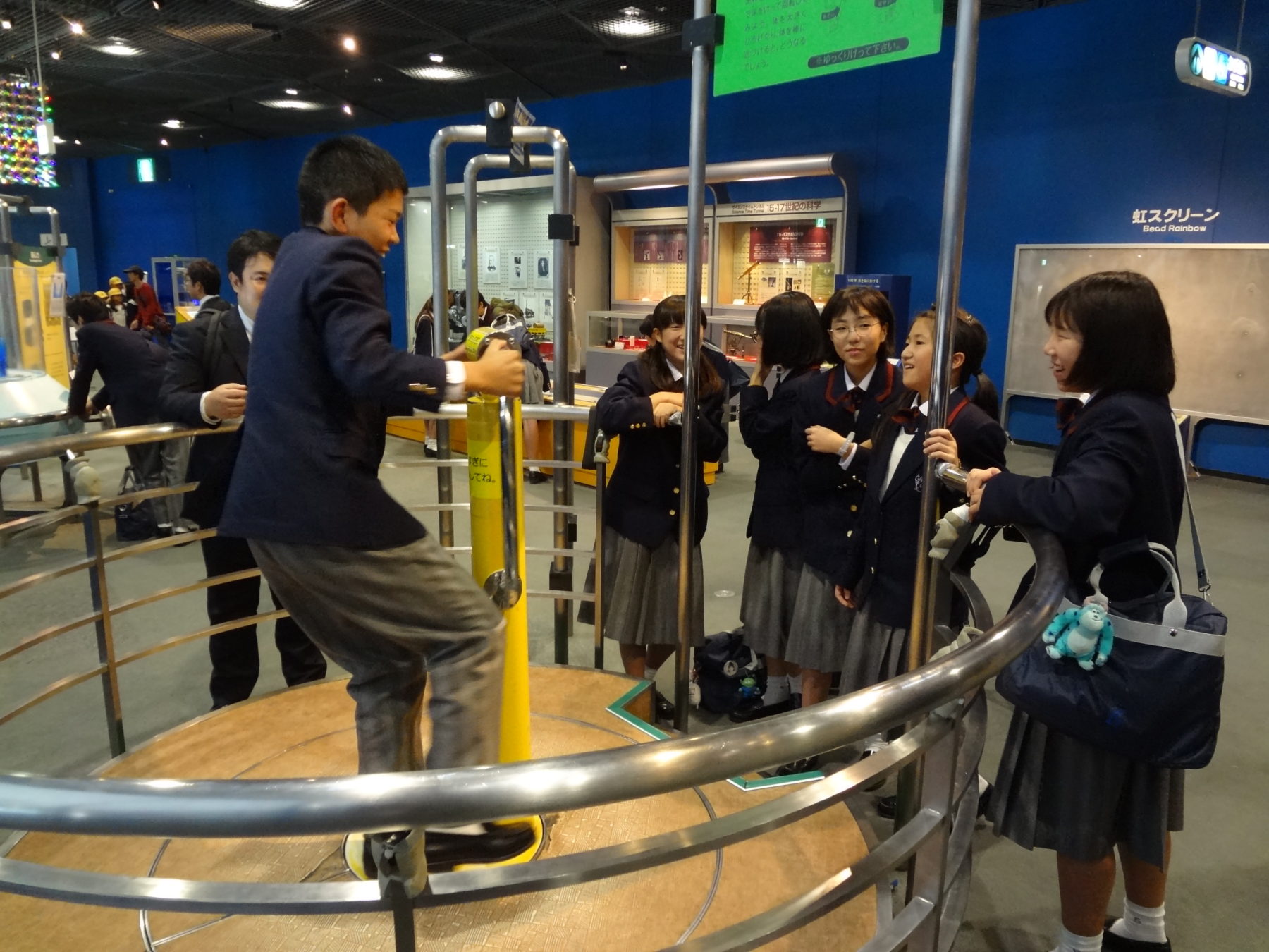 午後からは大阪市立科学館にいきました。こちらも班に分かれて実物資料や実験装置を見学し、興味をもったものやその原理などをワークシートにまとめていきました。日常では見慣れない宇宙や惑星の紹介、原理や法則を調べる実験装置にみんな興味津々でした。