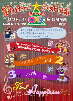 12月21日(土)の午後、Winter Festival が開かれ、生徒たちは保護者の皆様と共に、楽しい時間を過ごしました。