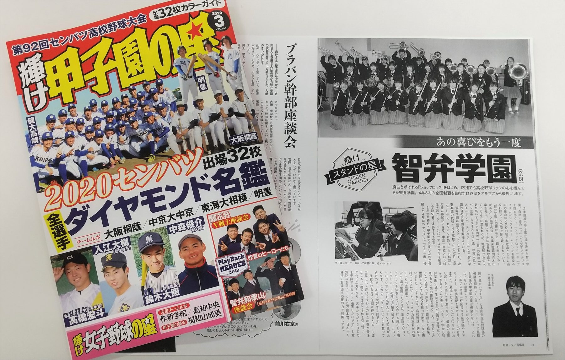 高校野球雑誌『輝け甲子園の星』(発行/株式会社ミライカナイ)の「輝けスタンドの星」という特集ページで本校の吹奏楽部が紹介されました。生徒会会長の応援に向けた意気込みや、「ブラバン幹部座談会」では吹奏楽部員の野球応援に対する思いを語らせていただきました。ぜひ、ご覧ください。