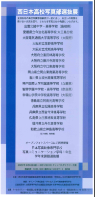 3/6(金)~12(木)まで、オリンパスギャラリー大阪で開催される予定だった、「西日本高校写真部選抜展」のイベント・展示が、新型コロナウィルス対策の影響で中止になりました(審査は行なわれる予定)。