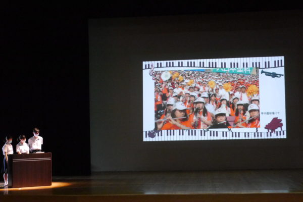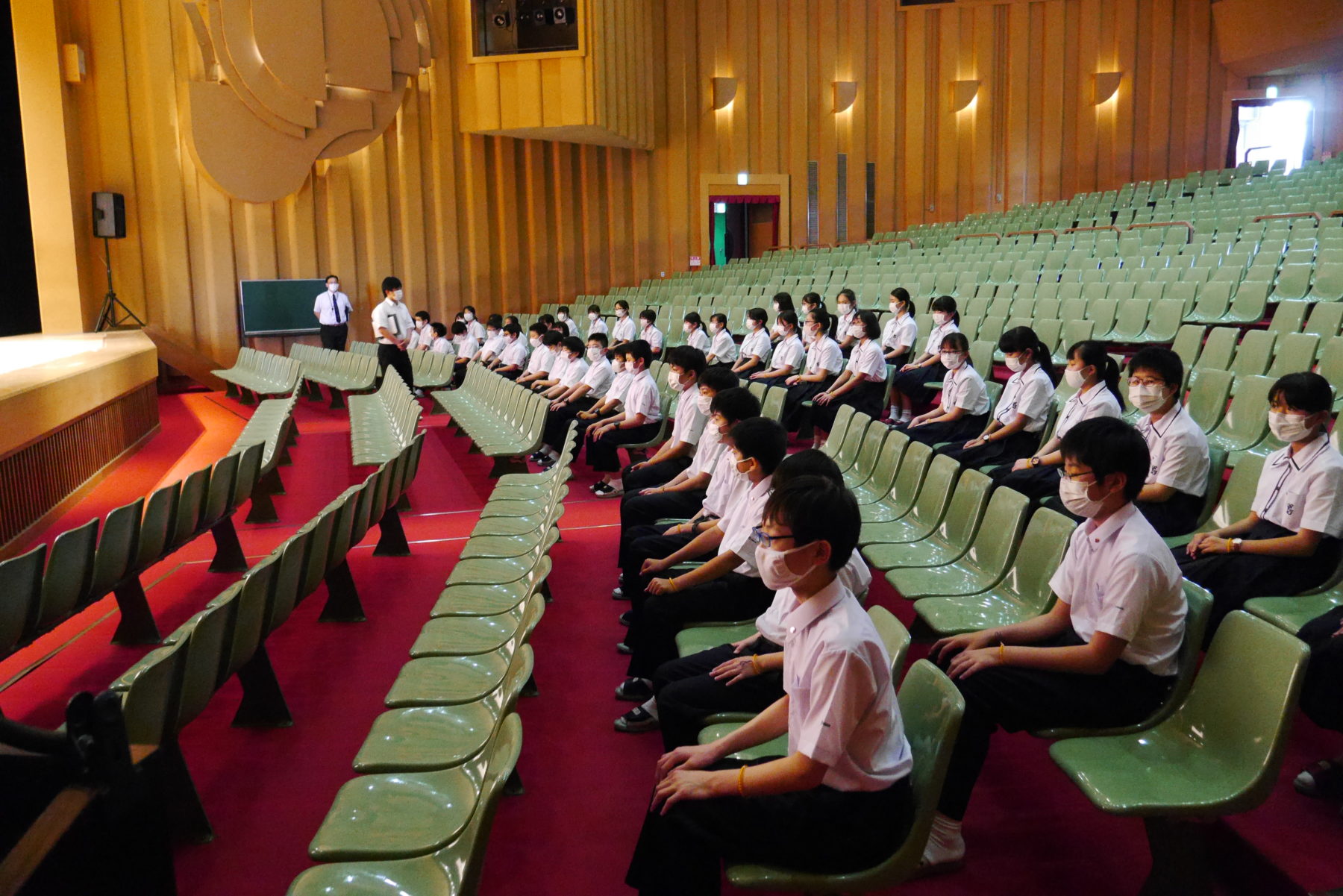 6月4日の5時間目、新入生への「クラブ紹介」が講堂で行われました。司会は放送部の岸岡くん、分散登校中のため、参加生徒は半分です。