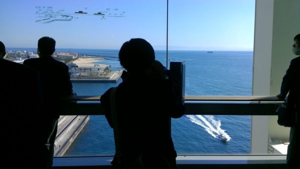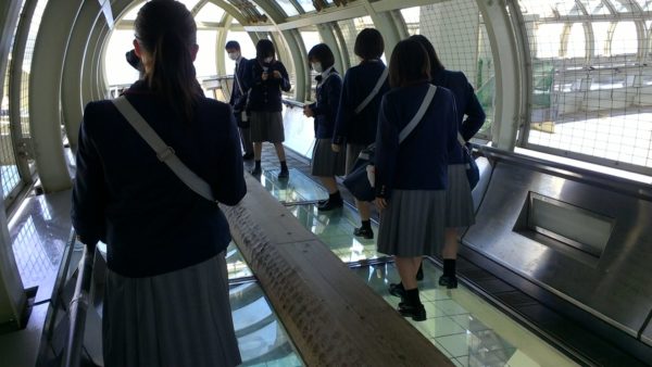 次に訪れた舞子海上プロムナードは、世界一のつり橋「明石海峡大橋」の神戸市側に添加施設として同時施工され1998年4月5日に開設された海面からの高さ約47m、陸地から約150m、明石海峡へ突出した延長約317mの回遊式遊歩道です。普段見ることができない角度から橋や海の様子を見学できるとあって、生徒たちの感激もひとしおでした。