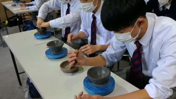 そして、備前焼工房では、土ひねり体験を行いました。薪窯を使い、本格的に焼き上げる陶芸体験で、本格的な備前焼が仕上がるとあって、生徒たちは真剣に取り組んでいました。個性の光る作品の数々…とても上手に出来ました。後日、焼きあがったものが郵送されてくるそうです。出来上がりが楽しみです。