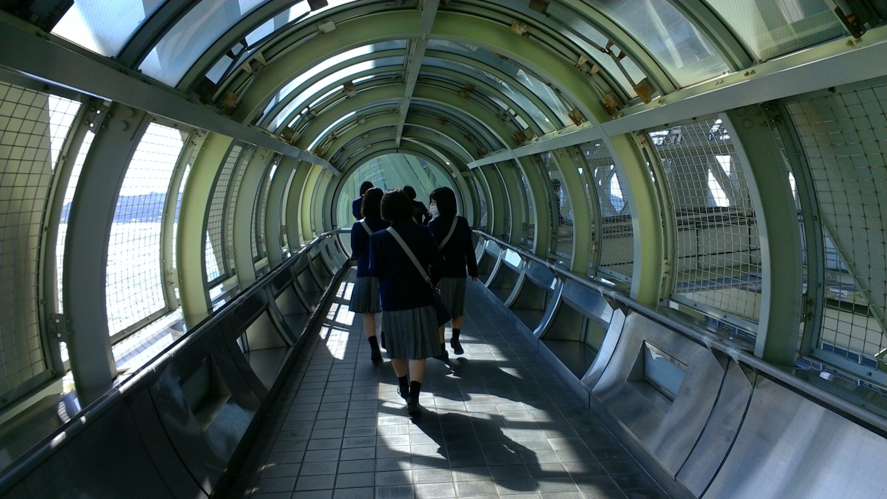 次に訪れた舞子海上プロムナードは、世界一のつり橋「明石海峡大橋」の神戸市側に添加施設として同時施工され1998年4月5日に開設された海面からの高さ約47m、陸地から約150m、明石海峡へ突出した延長約317mの回遊式遊歩道です。普段見ることができない角度から橋や海の様子を見学できるとあって、生徒たちの感激もひとしおでした。