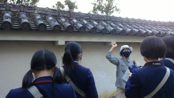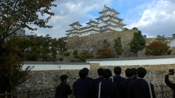また、姫路城では、シルバーガイドさんの案内のもと、世界文化遺産、そして国宝でもある姫路城について深く知り、学ぶことができました。シラサギが羽を広げたような優美な姿から「白鷺城」の愛称で親しまれる姫路城。白漆喰総塗籠造りの鮮やかな白の城壁や5層7階の大天守と東、西、乾の小天守が渡櫓で連結された連立式天守が特徴的で、生徒たちはその迫力と美しさに魅了されていました。
