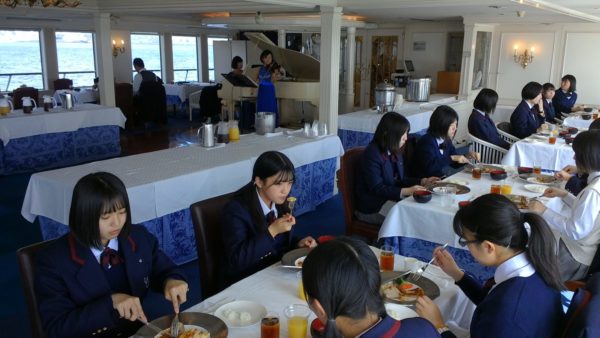 そしていよいよお待ちかねのランチクルーズです。モザイク大観覧車が目印の神戸ハーバーランドから乗船しました。先ほど見学したポートタワーや海洋博物館、また、メリケンパークオリエンタルホテルが並ぶ神戸の代表的な風景を眺めながら、海洋へと旅立ちました。メニューは、豪華なランチコースです。プロによるピアノとバイオリンの生演奏を聴きながら少し背伸びをして優雅に味わいました。