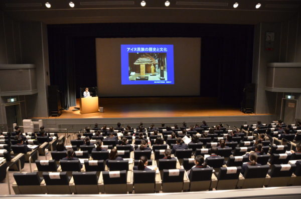 午前中は、国立民族学博物館准教授の齊藤玲子先生に、アイヌ民族についてご講演いただきました。短い時間ではありましたが、アイヌの歴史や文化・暮らしについてお話しいただき、生徒たちは先生のお話に聞き入っていました。