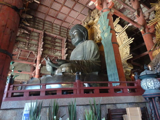聖武天皇が即位後、全国に天然痘が流行し、各地で災害や反乱がおこりました。天皇は人々の心の不安を取り除くため、仏教の力で平和と共生を願いました。大仏造立にあたり「一枝の草、一把の土」を持ち寄って「すべてのものの幸福のため、みんなの力と思いを集めて大仏を共に作りたい。」と呼びかけます。天皇の呼びかけから10年たった752年にようやく東大寺の大仏は完成の日を迎えます。その後も戦乱のために2度も焼け落ちた大仏ですが、聖武天皇の思いを受けつぎ、人々の小さな力と思いを集めて復興を果たし、今の大仏様のお姿があります。私たちは大仏様の目前で手を合わせ、新型コロナウイルスの収束を願いました。