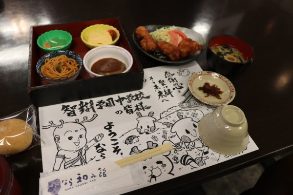 「なら和み館」で、おいしい昼食をいただきました。素敵な敷紙を用意していただきました。