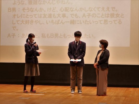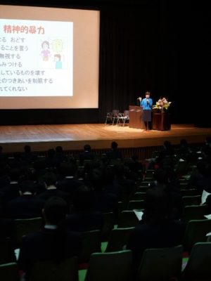 期末考査最終日の12月4日(金)に、「参画ネットなら」より風味良美先生・松村徳子先生をお招きして、高校3年生対象の人権教育講演会として、『男女共同参画社会をめざして』の講演をして頂きました。前半は、現在の日本の女性の社会参加の状況や国の取り組みについて、後半はその社会参加を阻むことにもなるDVやデートDVについてお話頂き、これから社会に巣立っていく身として大切な、知識や心を学ぶ機会となりました。