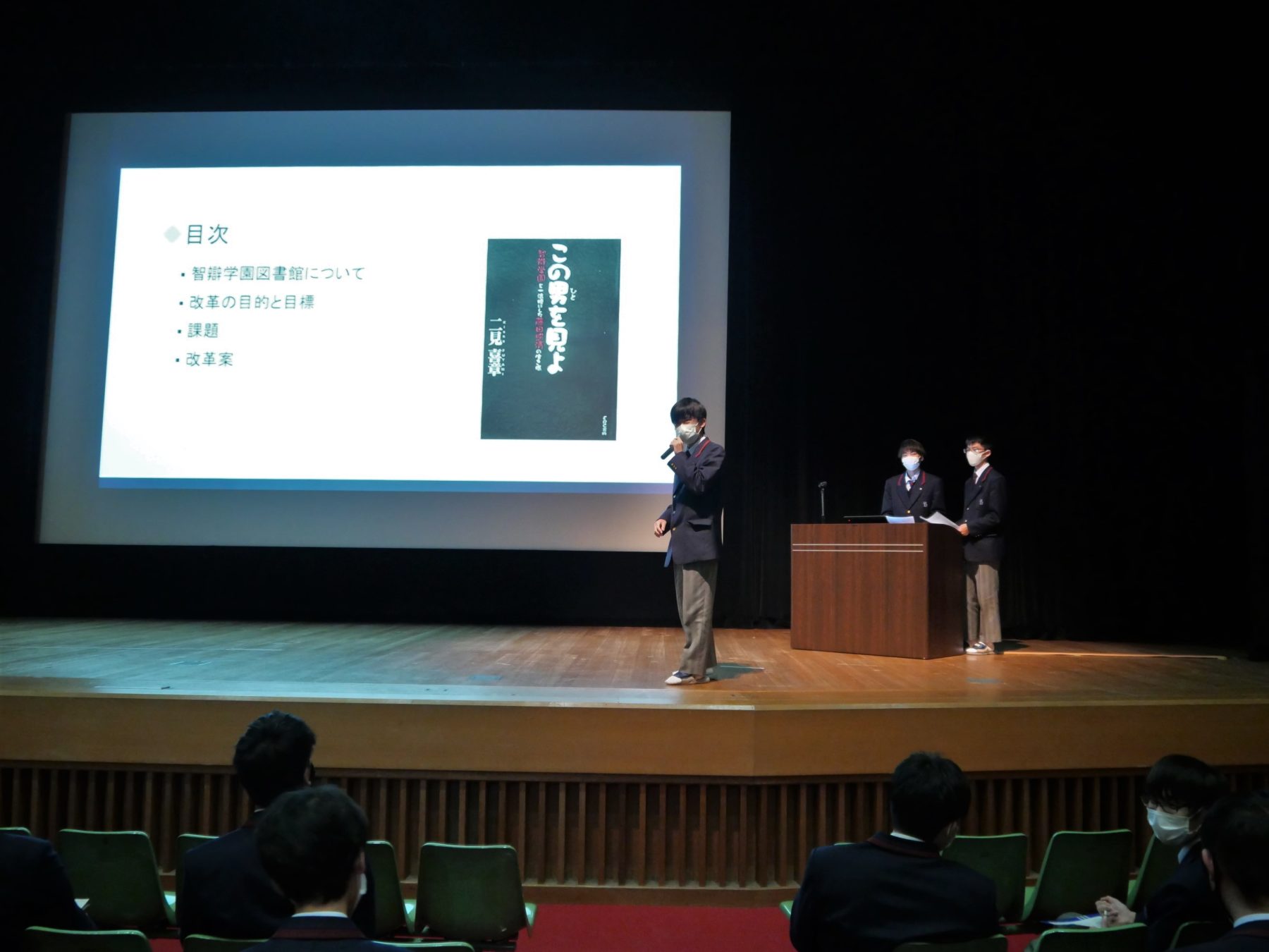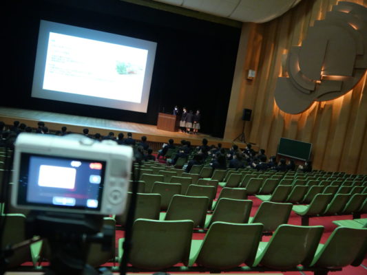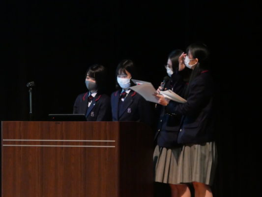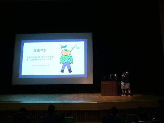 講堂で、学年全生徒を前にしての発表ということもあり、各グループそれぞれが工夫を凝らした素晴らしい発表をしています。