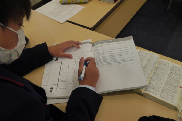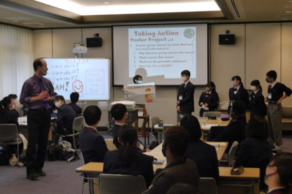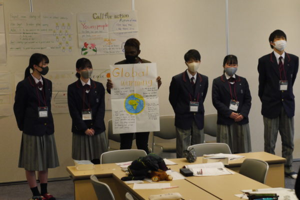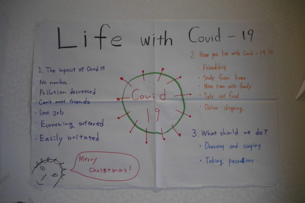 また、「地域に貢献するボランティアプラン」や、「世界で起きている諸問題の解決に向けて」「コロナウイルスとの共存」、などについて、チームで意見をまとめ、図に表して発表しました。