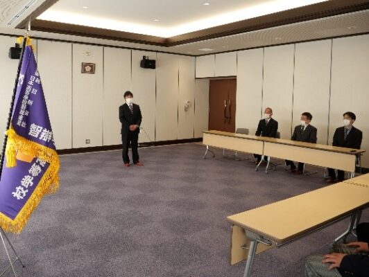 2月22日(月)、第93回選抜高等学校野球大会の選抜旗授与式が行われました。毎日新聞社奈良支局長 堀川剛護様より選抜旗が本校の手塚彰校長を経て、山下陽輔主将に授与されました。続いて堀川様と奈良県高等学校野球連盟会長 永井工仁様よりご祝辞を頂き、毎日新聞奈良・三重専売会様より練習球を贈呈して頂きました。最後に山下主将が謝辞と大会への抱負を述べました。