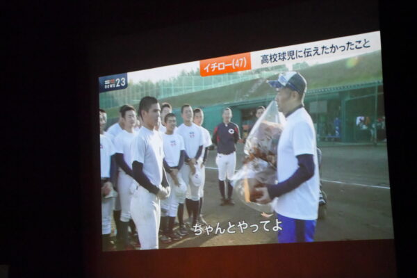 藤田理事長先生はお諭しの中で、野球部の甲子園での活躍に期待すると話されたあと、イチロー氏(シアトルマリナーズの会長付き特別補佐兼インストラクター)が昨秋、和歌山校を訪れて野球部に指導された様子をまとめた映像を、生徒たちに紹介されました。