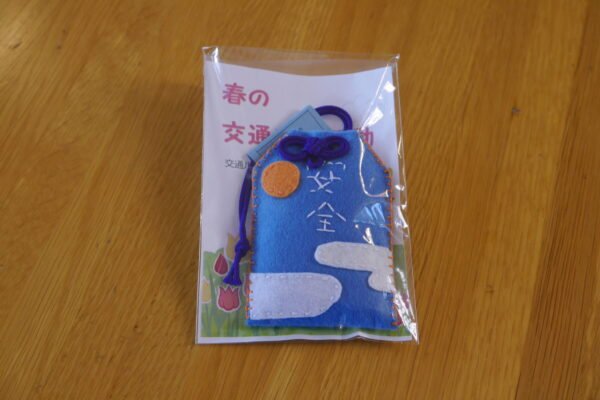 この「交通安全のお守りづくり」の取り組みは、3年前から始まり、コロナ禍以前は生徒が実際にドライバーさんにお守りを手渡ししていました。今年は、本校と奈良カレッジ校が100ずつ作成し、大会参加者約170名に配布されました。。(写真は、2019年のものです)