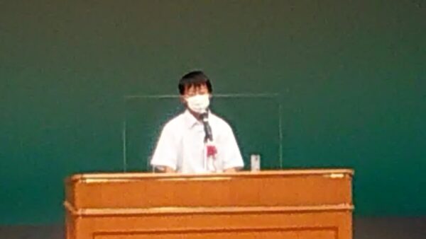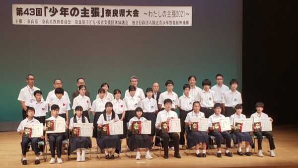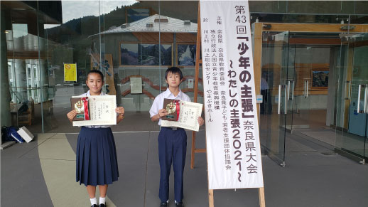 9月5日(日)に第43回「少年の主張」奈良県大会が開催されました。3341作品の応募の中から本校では中学1年俵正憲君の「物を大切にする心」、中学2年小坂里緒さんの「私の大きな夢」が選ばれ、川上村川上総合センターやまぶきホールで発表しました。その結果、俵君と小坂さんはともに優良賞を受賞しました。