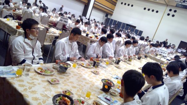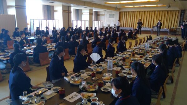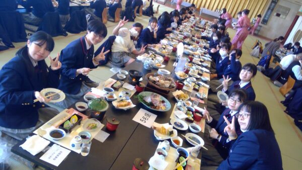 1日目は定刻通り、学園を出発し、うめ丸で昼食をとりました。うめ丸は鯛料理が名物で、「鯛の姿盛り」「鯛の蒸し焼きば」「鯛の煮つけ」など、鯛を中心とした海鮮料理をいただきました。