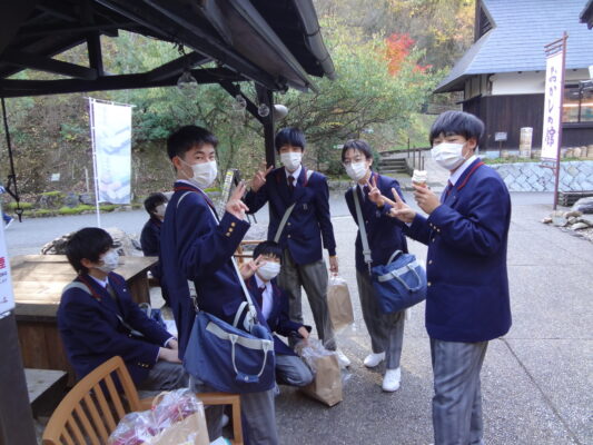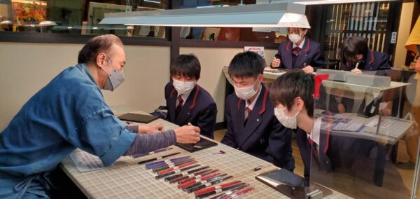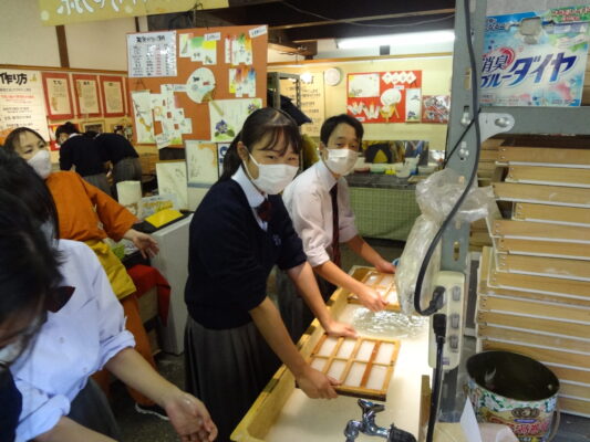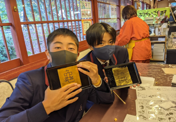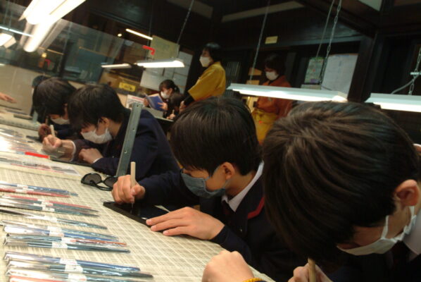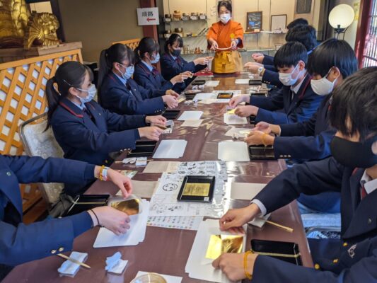二つ目の訪問先、加賀伝統工芸村「ゆのくにの森」では金箔貼り、山中漆器、輪島塗、紙すきをグループに分かれて体験しました。