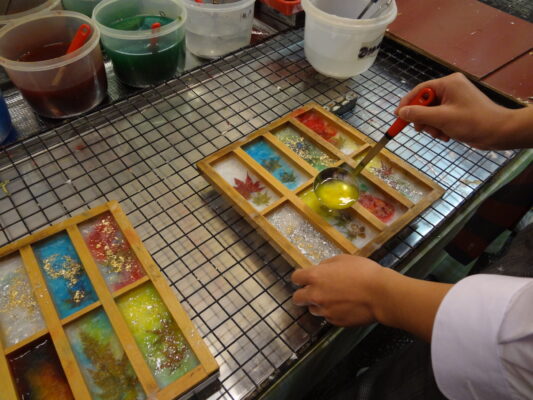 糊を塗ったトレーに金箔をそっと置き、文字やイラストを描きました。