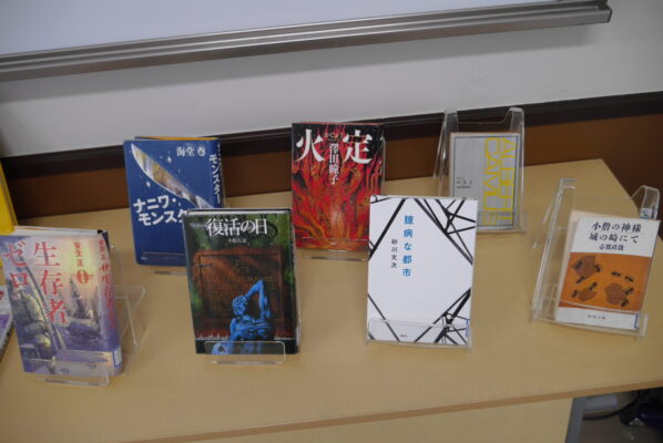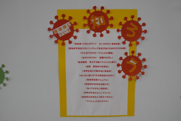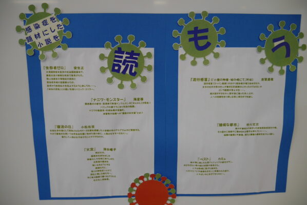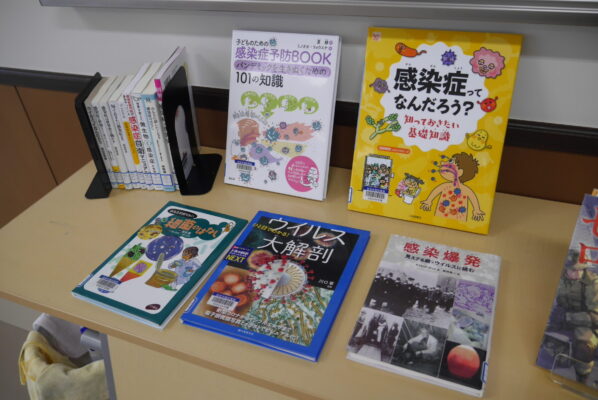 校舎2階「スチューデントコモンズ」の一角に出張図書館コーナーがあり、「感染症」に関する実用書と小説が紹介されています。