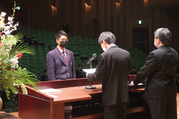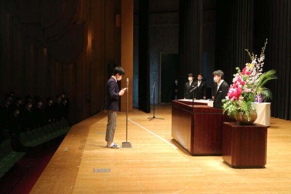 手塚彰校長先生は卒業生に、義務教育課程が修了したことを祝し、「未来を見据えて、結果が出るまでチャレンジしてほしい。」と話されました。そして学年生徒を代表して森田航平くんが中学校生活を振り返り、「コロナ禍にあって工夫して実施した学校行事は、とても充実していました。」「今後、智辯学園高等学校の生徒として、志望大学合格という目標が達成できるように頑張ります。」と、決意を表明しました。