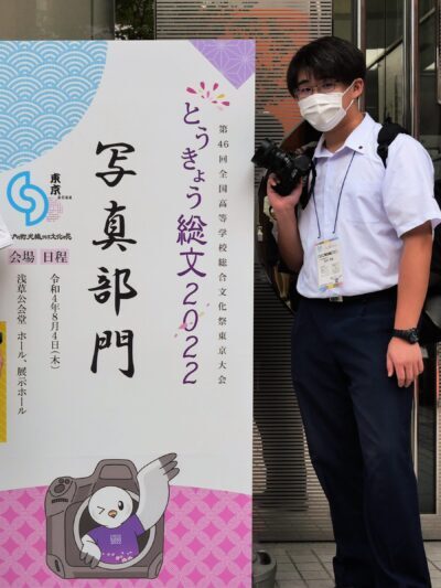 8月2~4日に東京都で開催された第46回全国高等学校総合文化祭東京大会写真部門に、高校3年の宮本有基くんが奈良県代表生徒として出場しました。初日は全国から選ばれた約300作品の展示観覧、代表生徒同士による交流会、ハービー山口氏・熊切大輔氏による講演会がありました。二日目は東京工芸大学の写真学科でのスタジオ撮影体験と都内各所(国会や東京大学、上野公園)のスナップ撮影をしました。最終日は大会優秀作品の表彰と講評、二日目の撮影作品の展示と最後まで盛りだくさんの内容で閉幕しましたが、何よりも全国の高校生との交流が財産となった3日間となりました。大変な時勢の中、大会開催に関わって下さった関係者の皆様、ありがとうございました。
